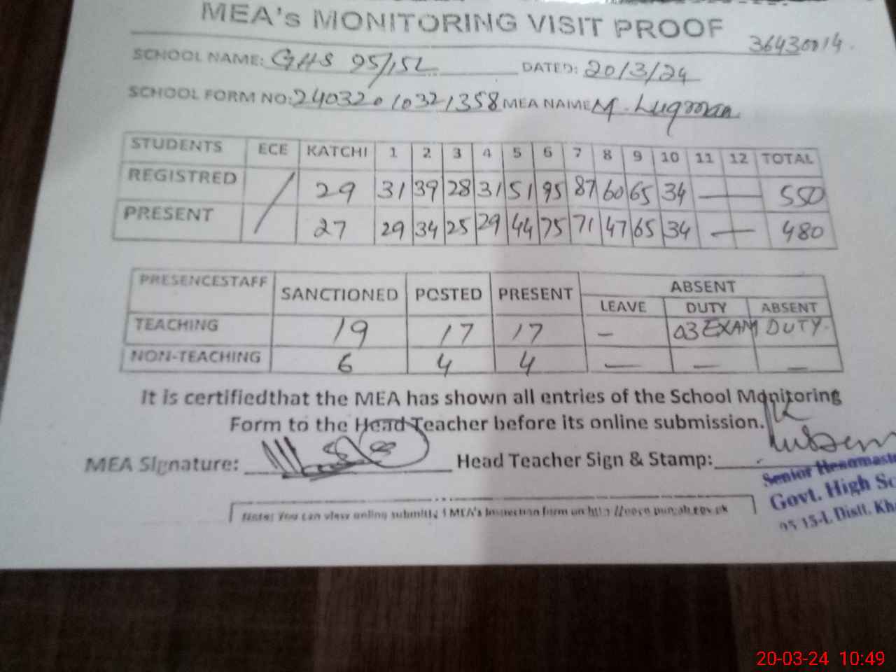 | Certified that this School was Inspected by the Undersigned MEA/DMO Today and the Information Stated Above is as Per Record. | |||||