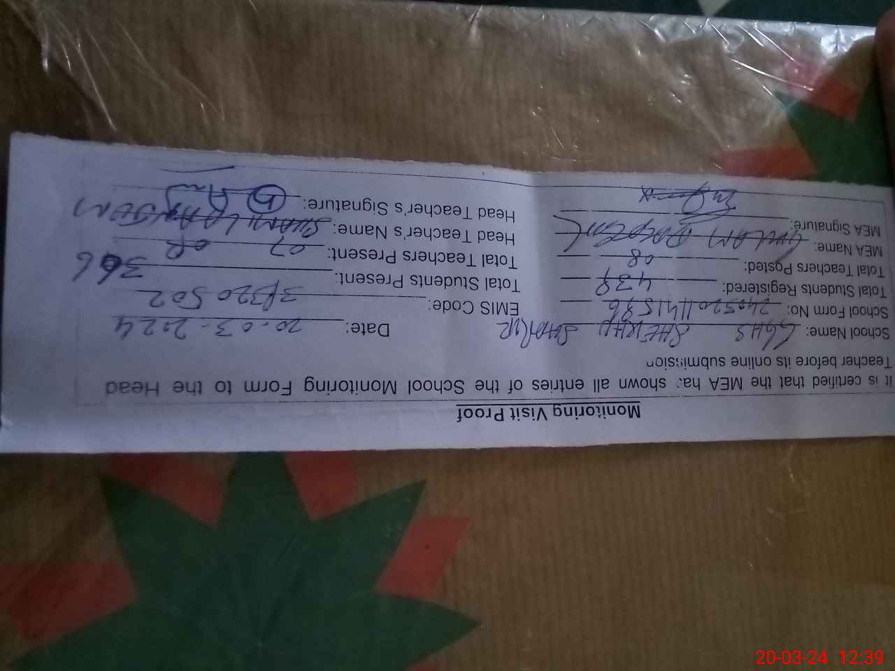 | Attendance Register | Head Teacher | MEA with School | Visit Proof |