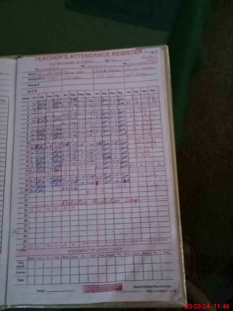 | 35**** | Gh**** Sh**** | PST | Regular | 2 | 0 | 0 | 0 | 0 | 0 | 0 | 0 | 2 | Exam Duty |