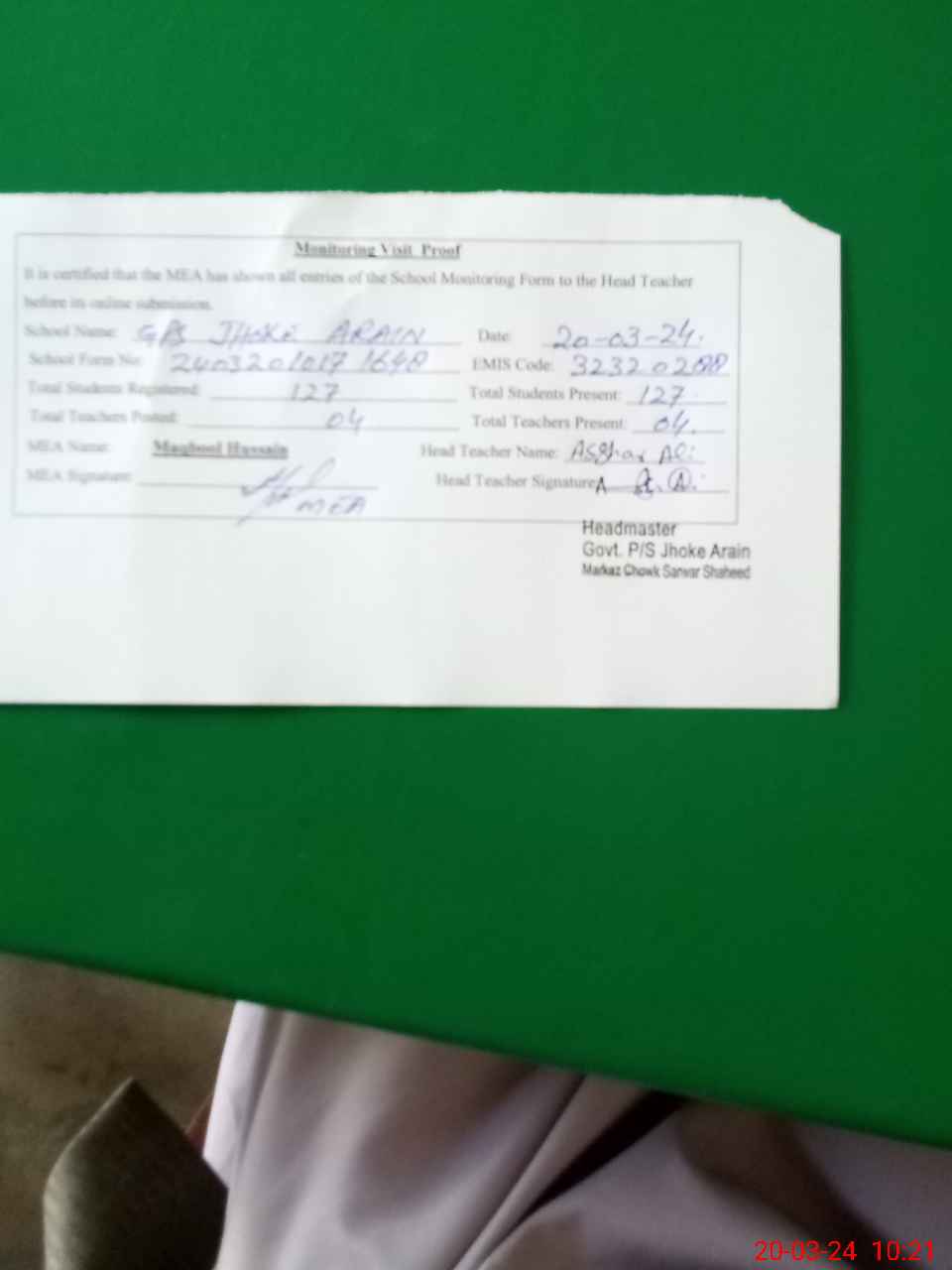 | EMIS Code: 32320288 | Name of School: GPS JHOKE ARAIN | |||