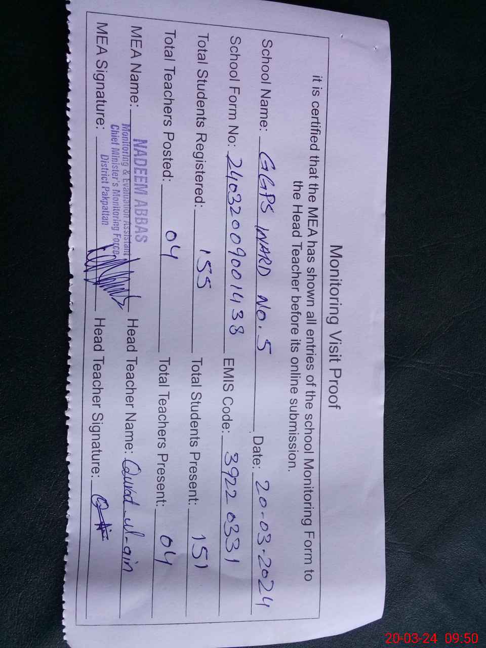 | Attendance Register | Head Teacher | MEA with School | Visit Proof |