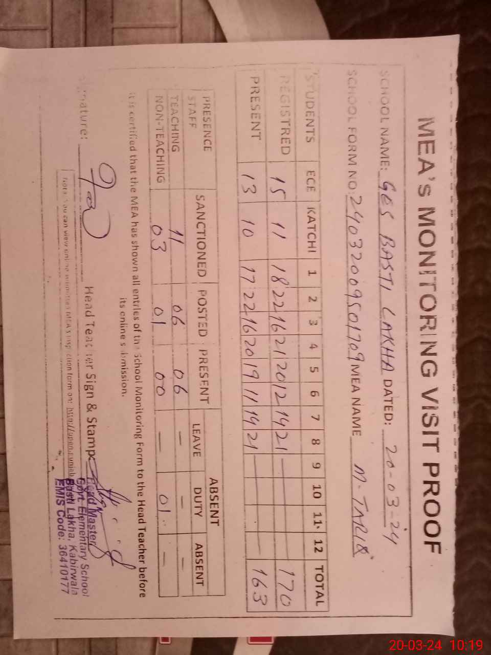 | EMIS Code: 36410177 | Name of School: GES BASTI LAKHA, MOUZA MARI SAHU, KABIRWALA | |||