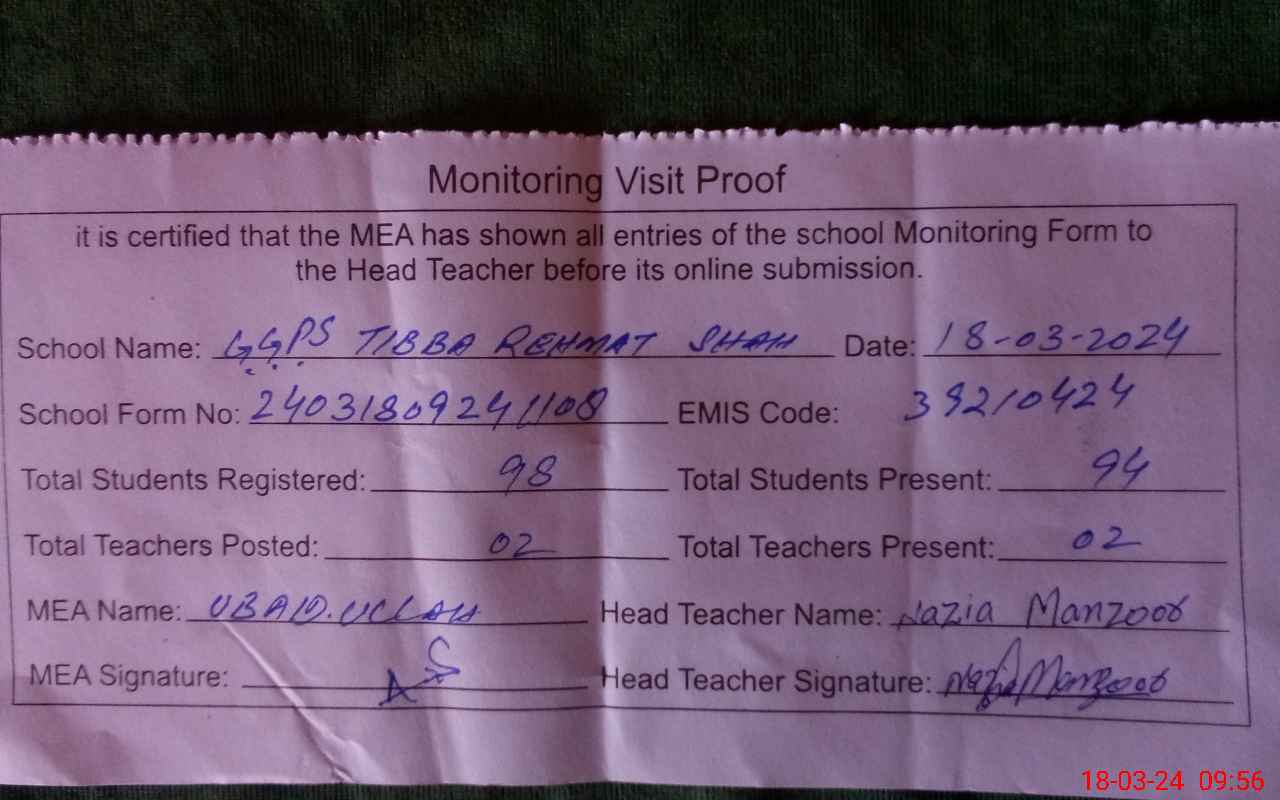 | EMIS Code: 39210424 | Name of School: GGPS TIBA REHMAT SHAH | |||