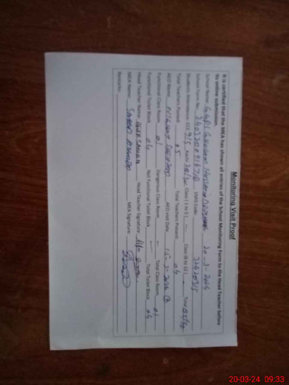 | Attendance Register | Head Teacher | MEA with School | Visit Proof |