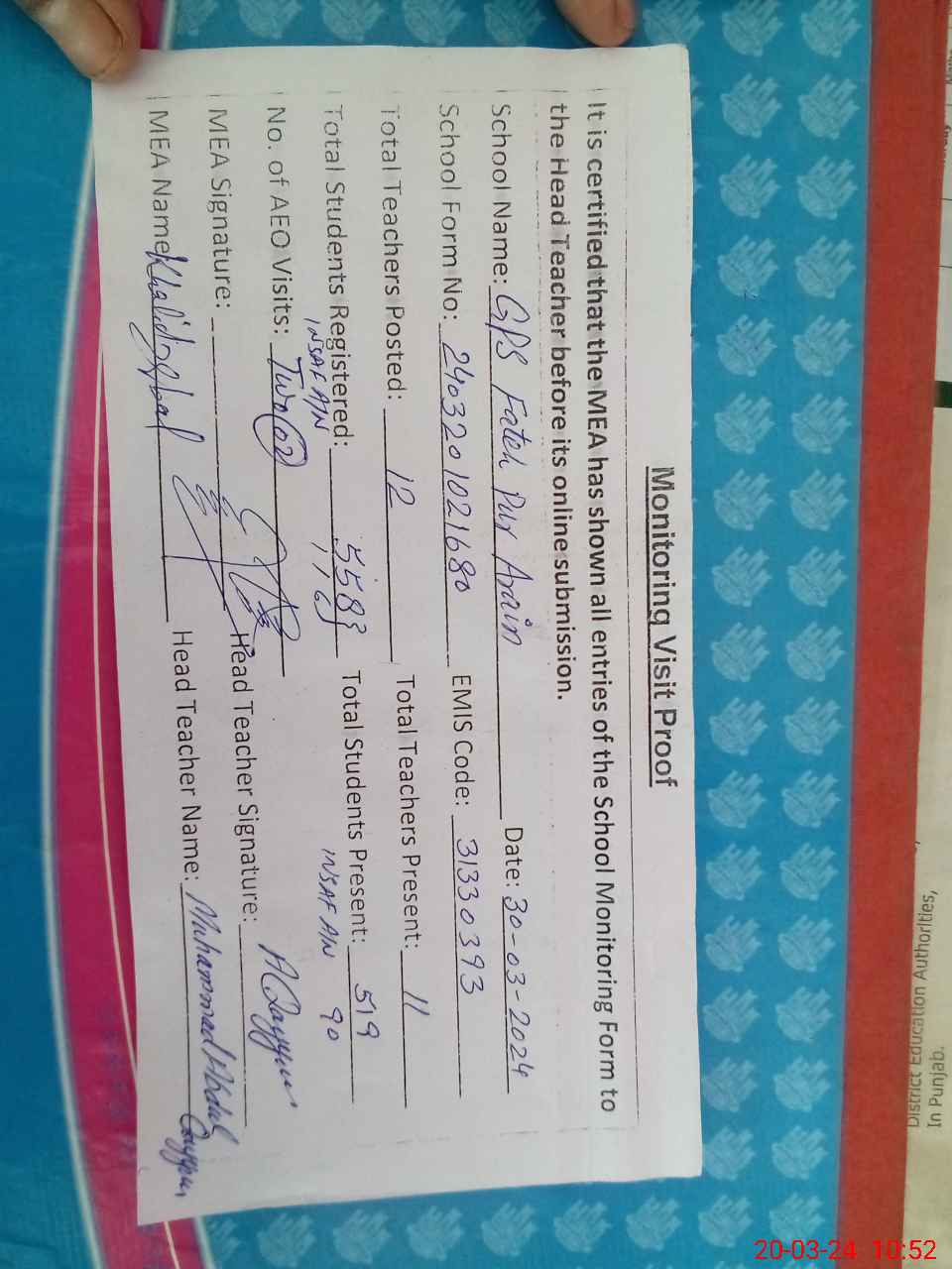 | EMIS Code: 31330393 | Name of School: GPS FATEH PUR ARAIN | |||