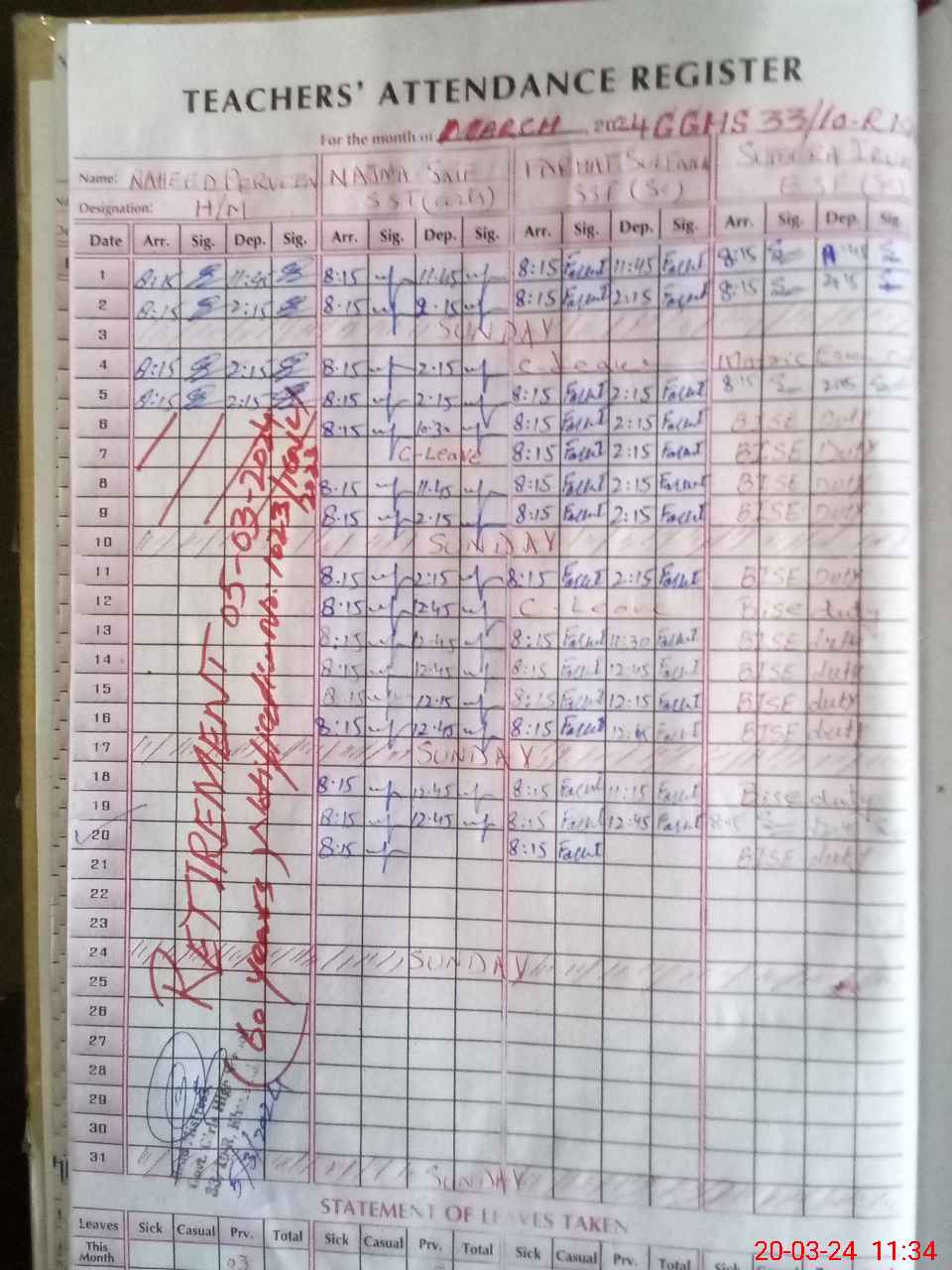| 36**** | Su**** Ir**** | 3 | 1 | 0 | 0 | 0 | 0 | 0 | 0 | 0 | 0 | 0 | Exam Duty |