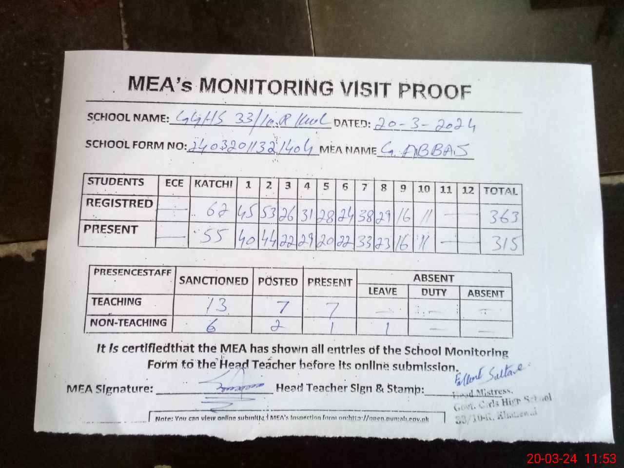 | Attendance Register | Head Teacher | MEA with School | Visit Proof |