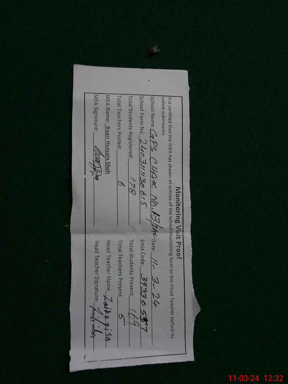 | Attendance Register | Head Teacher | MEA with School | Visit Proof |