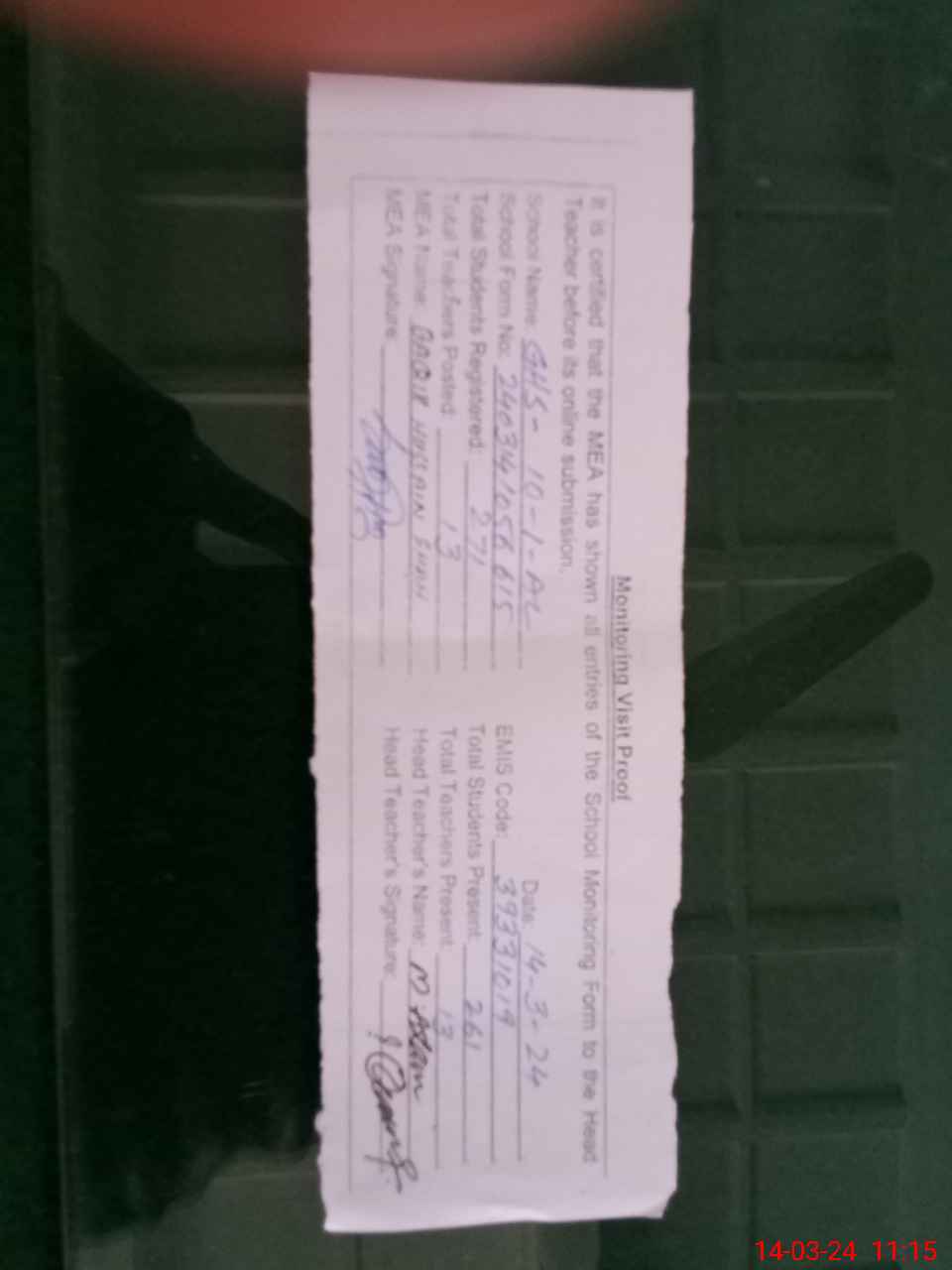 | Attendance Register | Head Teacher | MEA with School | Visit Proof |