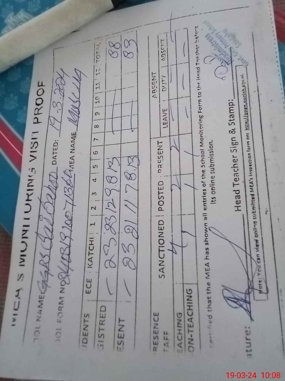| Attendance Register | Head Teacher | MEA with School | Visit Proof |