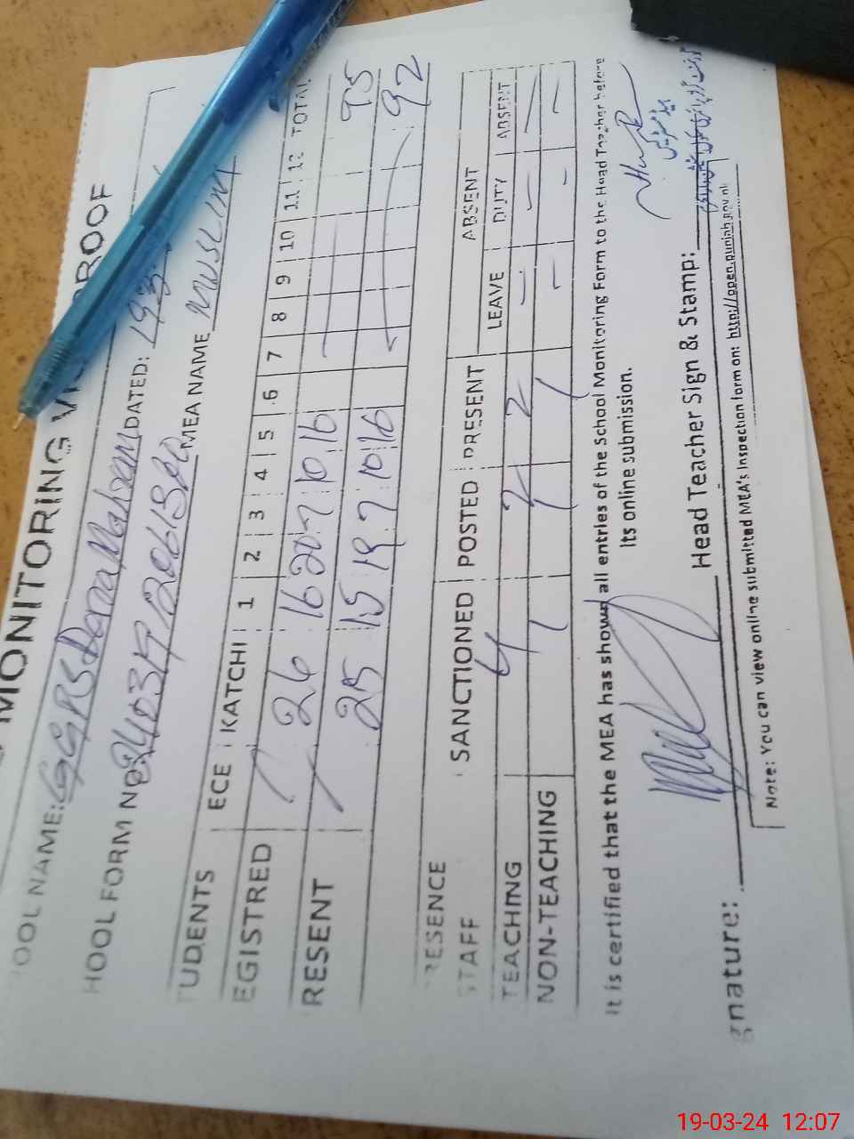 | Attendance Register | Head Teacher | MEA with School | Visit Proof |