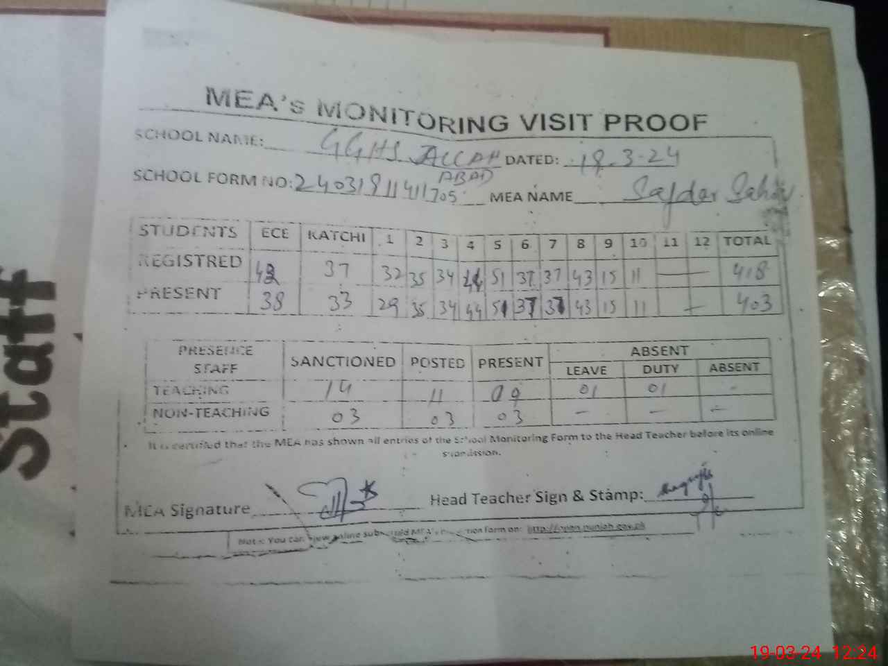 | Attendance Register | Head Teacher | MEA with School | Visit Proof |