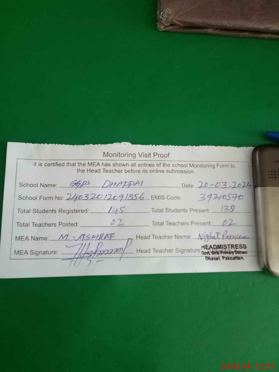 | Attendance Register | Head Teacher | MEA with School | Visit Proof |