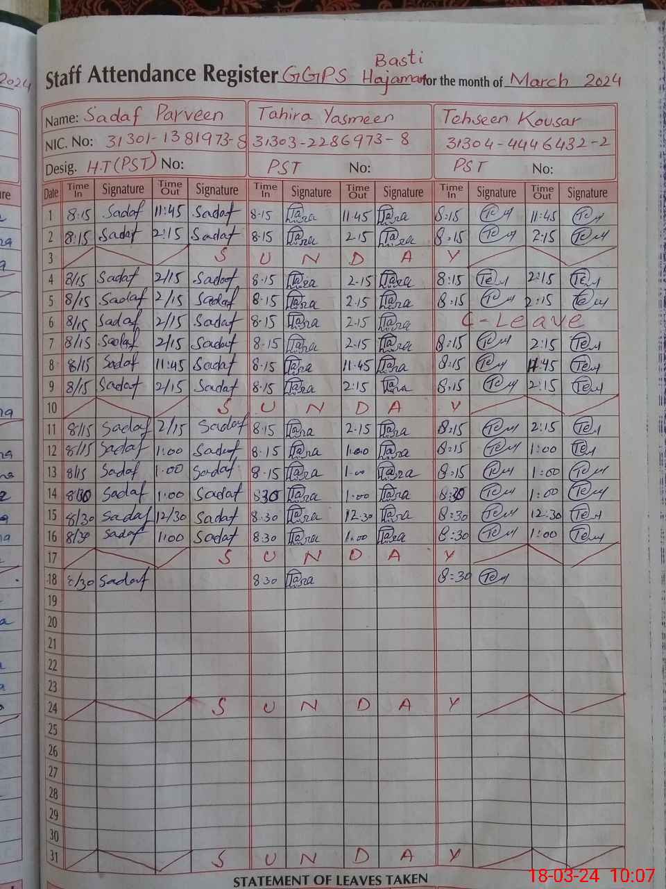 | CNIC | Full Name | Designation | R/C | Absence During Last Calender Month |