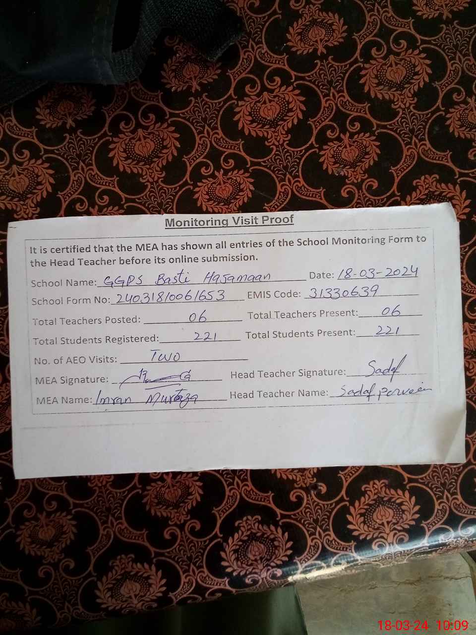 | Certified that this School was Inspected by the Undersigned MEA/DMO Today and the Information Stated Above is as Per Record. | |||||