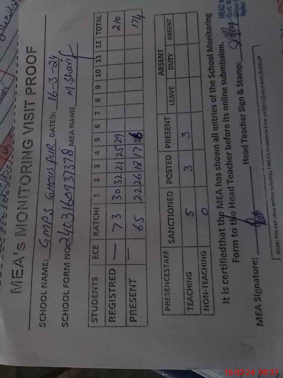 | Attendance Register | Head Teacher | MEA with School | Visit Proof |