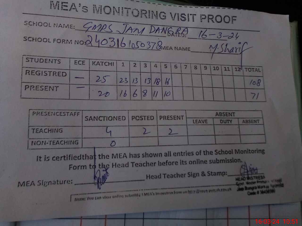 | Attendance Register | Head Teacher | MEA with School | Visit Proof |