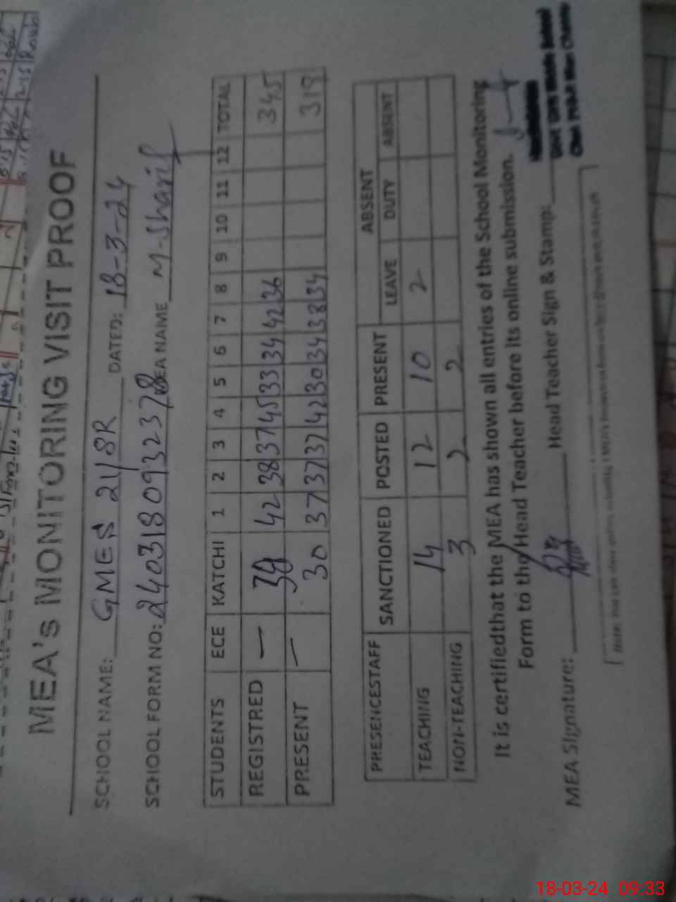 | Attendance Register | Head Teacher | MEA with School | Visit Proof |