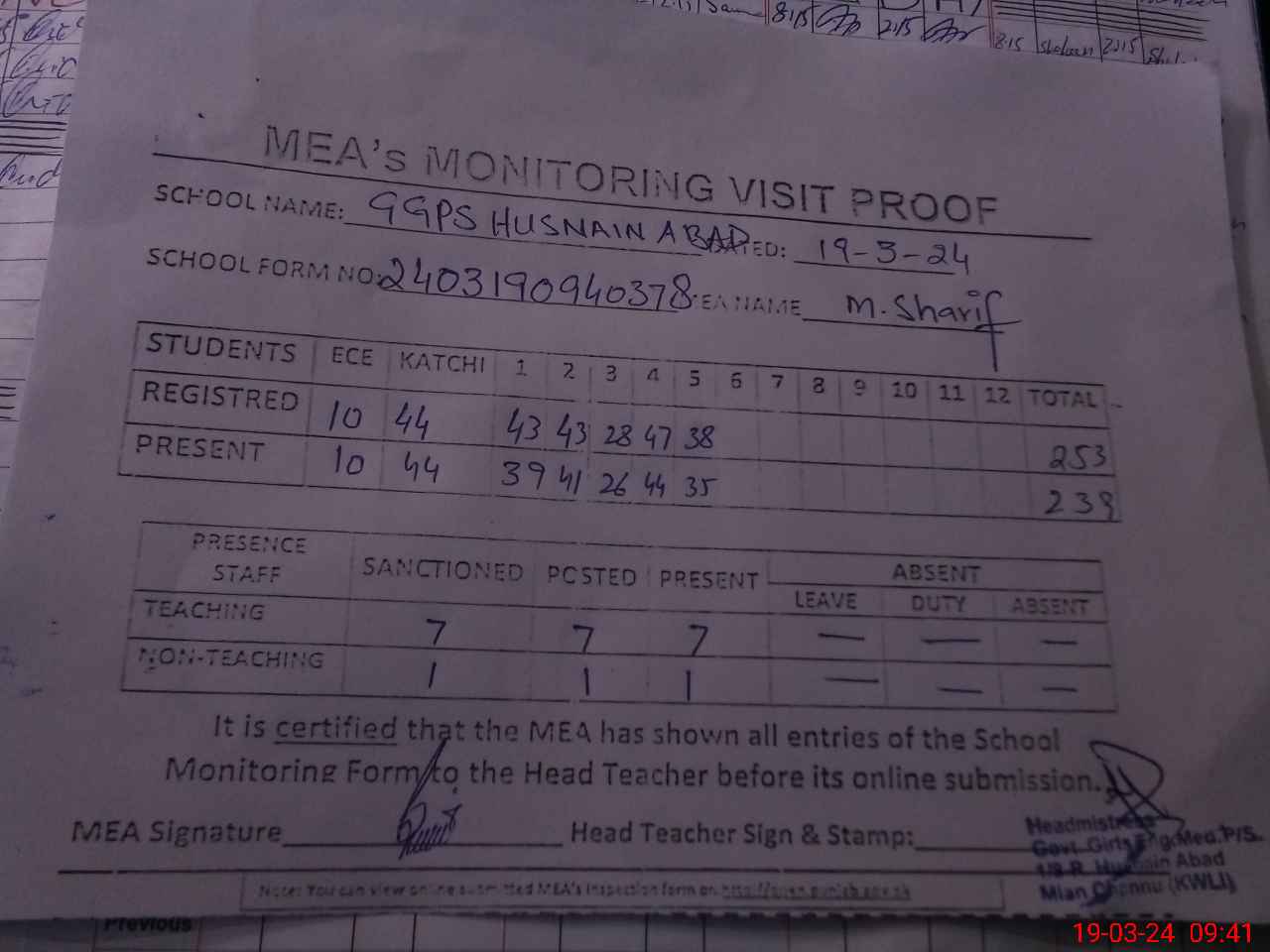 | Certified that this School was Inspected by the Undersigned MEA/DMO Today and the Information Stated Above is as Per Record. | |||||