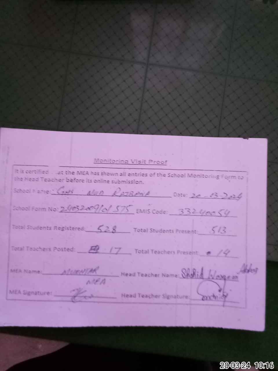 | Attendance Register | Head Teacher | MEA with School | Visit Proof |
