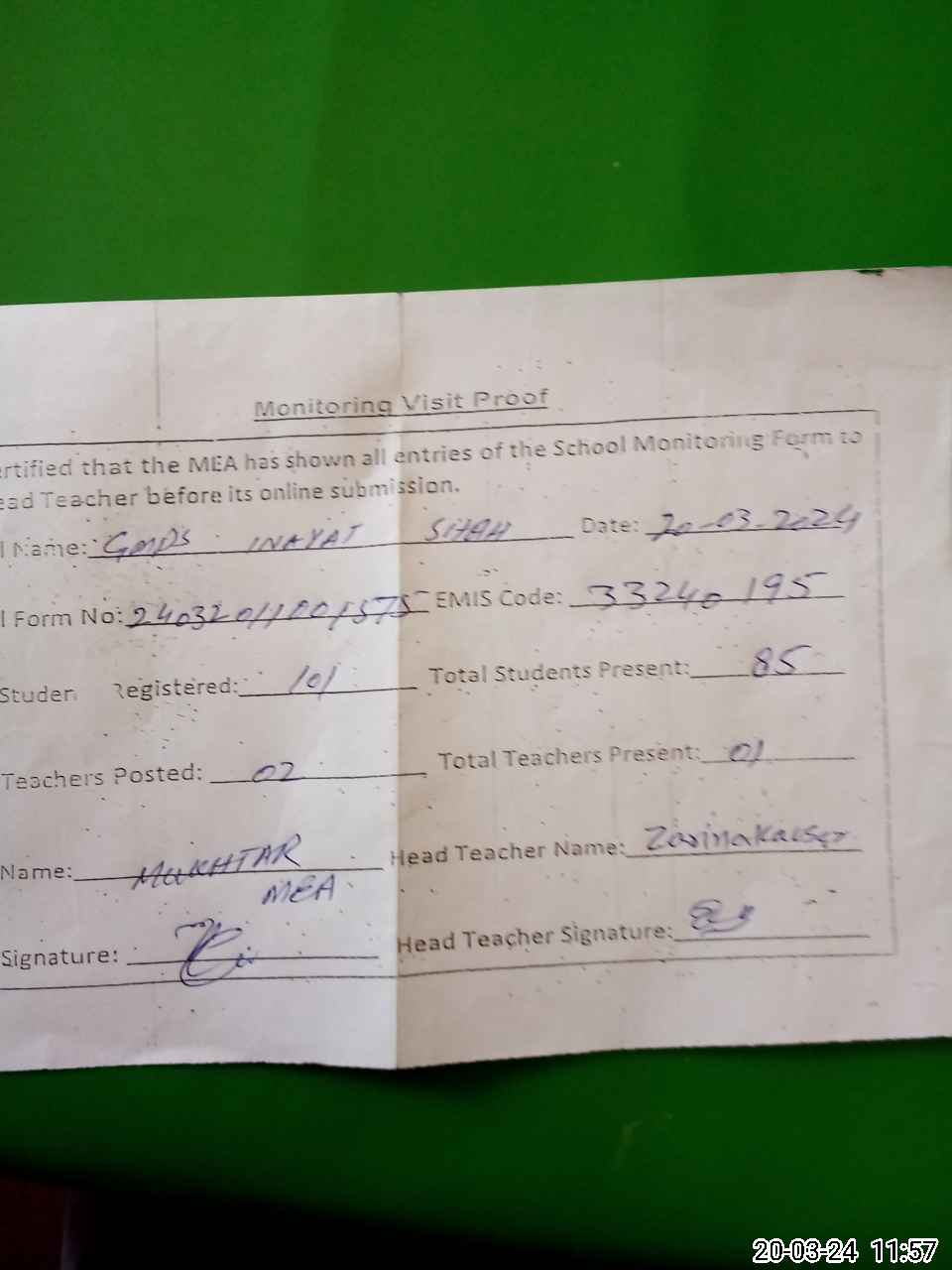 | EMIS Code: 33240195 | Name of School: GMPS ANAYAT SHAH | |||
