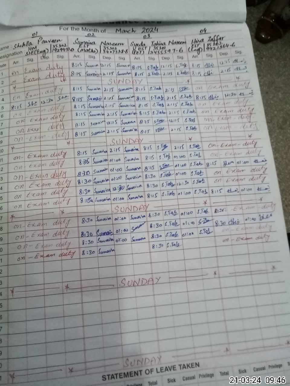 | 35**** | Hi**** Za**** | Regular | 2 | 0 | 0 | 0 | 0 | 0 | 0 | 0 | 2 | Exam Duty | |