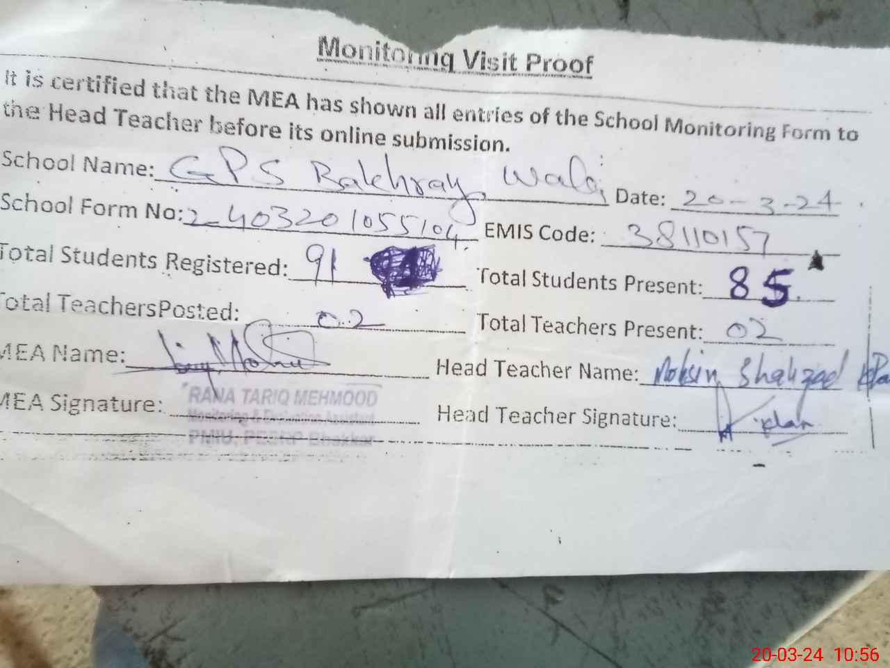 | Attendance Register | Head Teacher | MEA with School | Visit Proof |