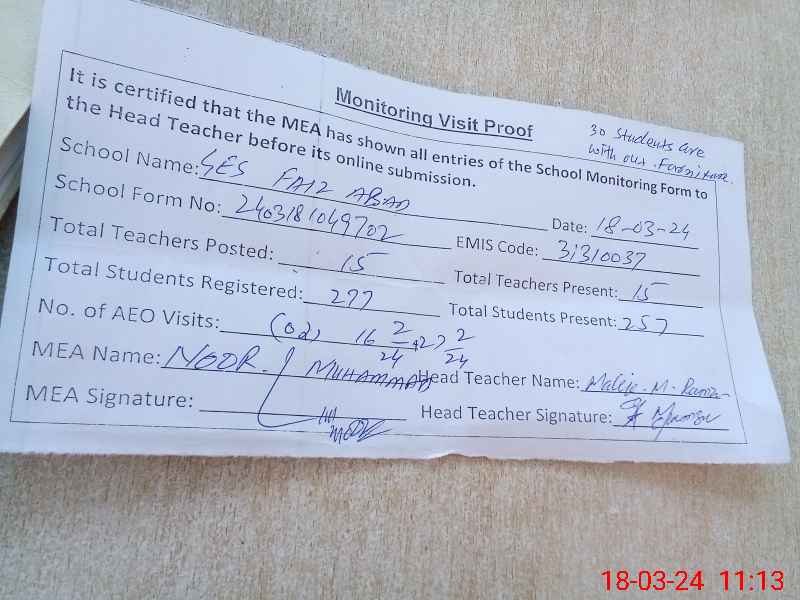 | EMIS Code: 31310037 | Name of School: GES FAIZ ABAD KHANPUR | |||