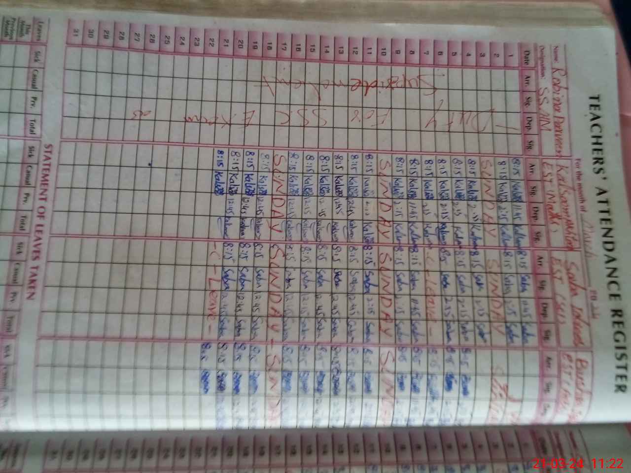| 33**** | Ro**** Pe**** | 1 | 2 | 1 | 0 | 0 | 0 | 0 | 0 | 0 | 2 | Absent (Un-Authorized) | |