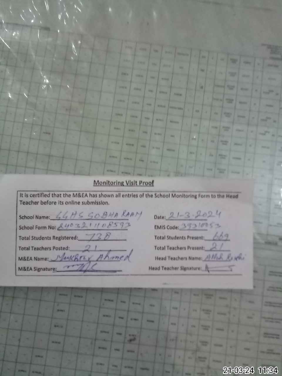 | Attendance Register | Head Teacher | MEA with School | Visit Proof |
