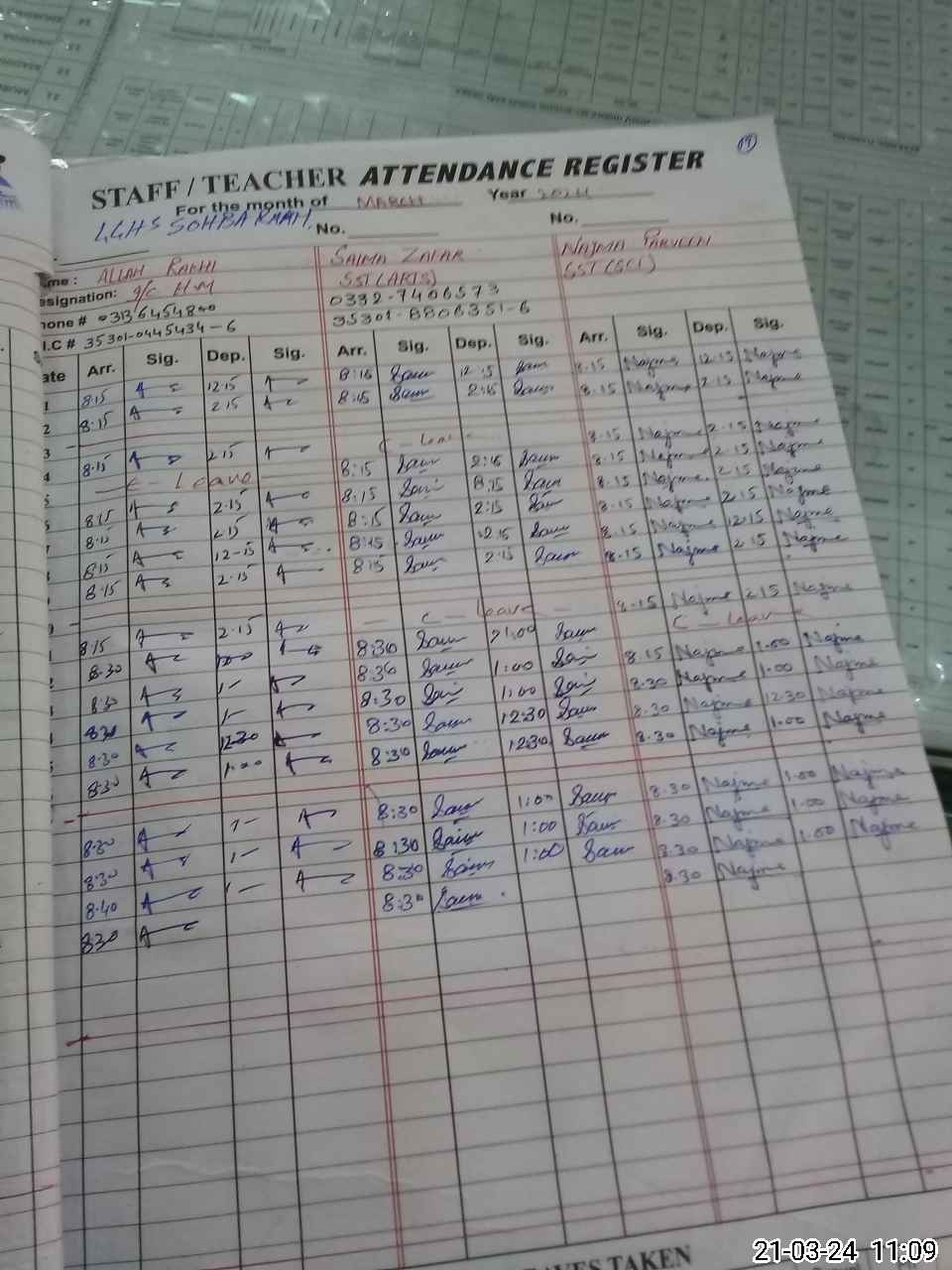 | CNIC | Full Name | Designation | R/C | Absence During Last Calender Month |