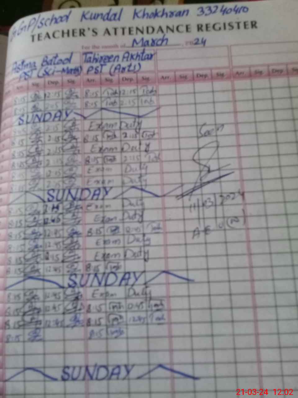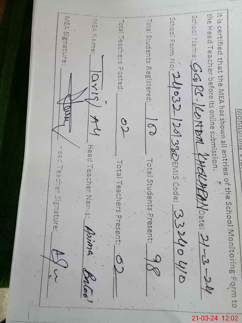 | Name: AS**** BA**** Designation: (School Headmaster's/Headmistress's) PST SC Phone/Cell Number: 03**** |