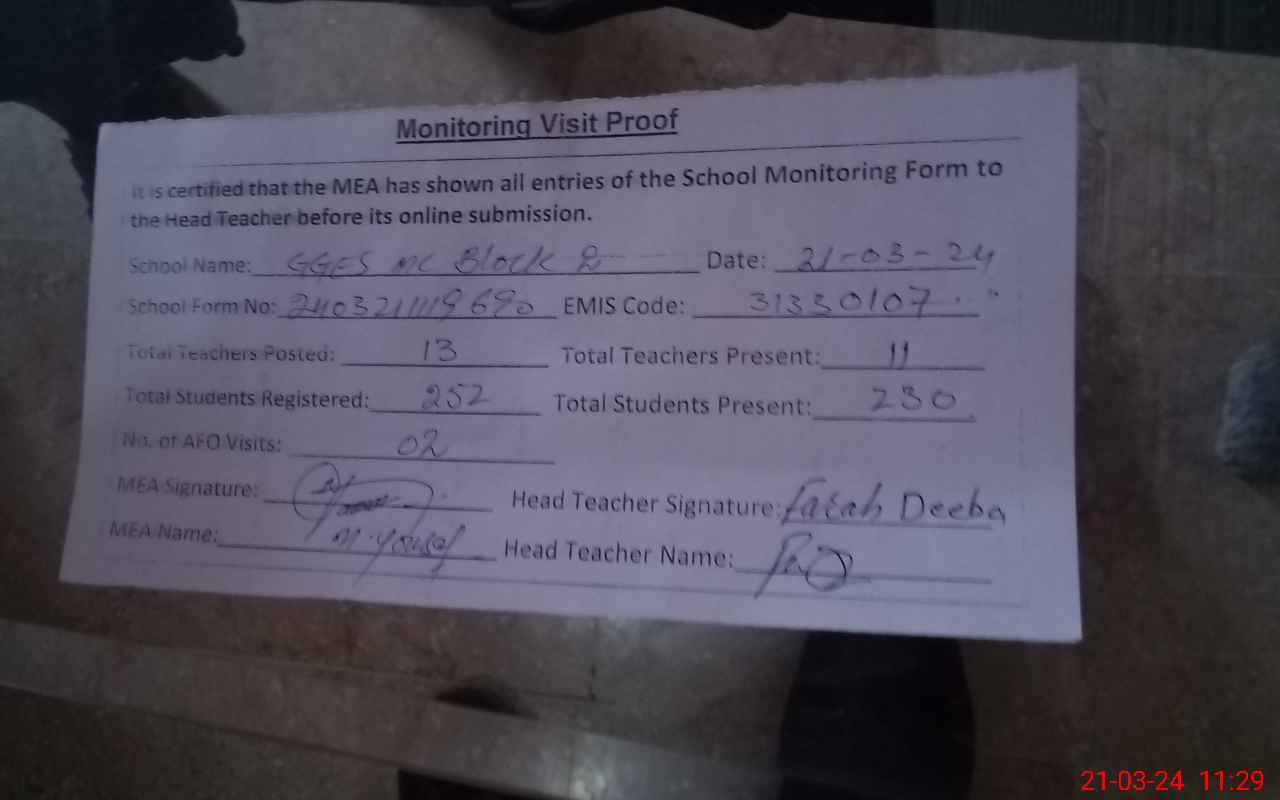 | Attendance Register | Head Teacher | MEA with School | Visit Proof |
