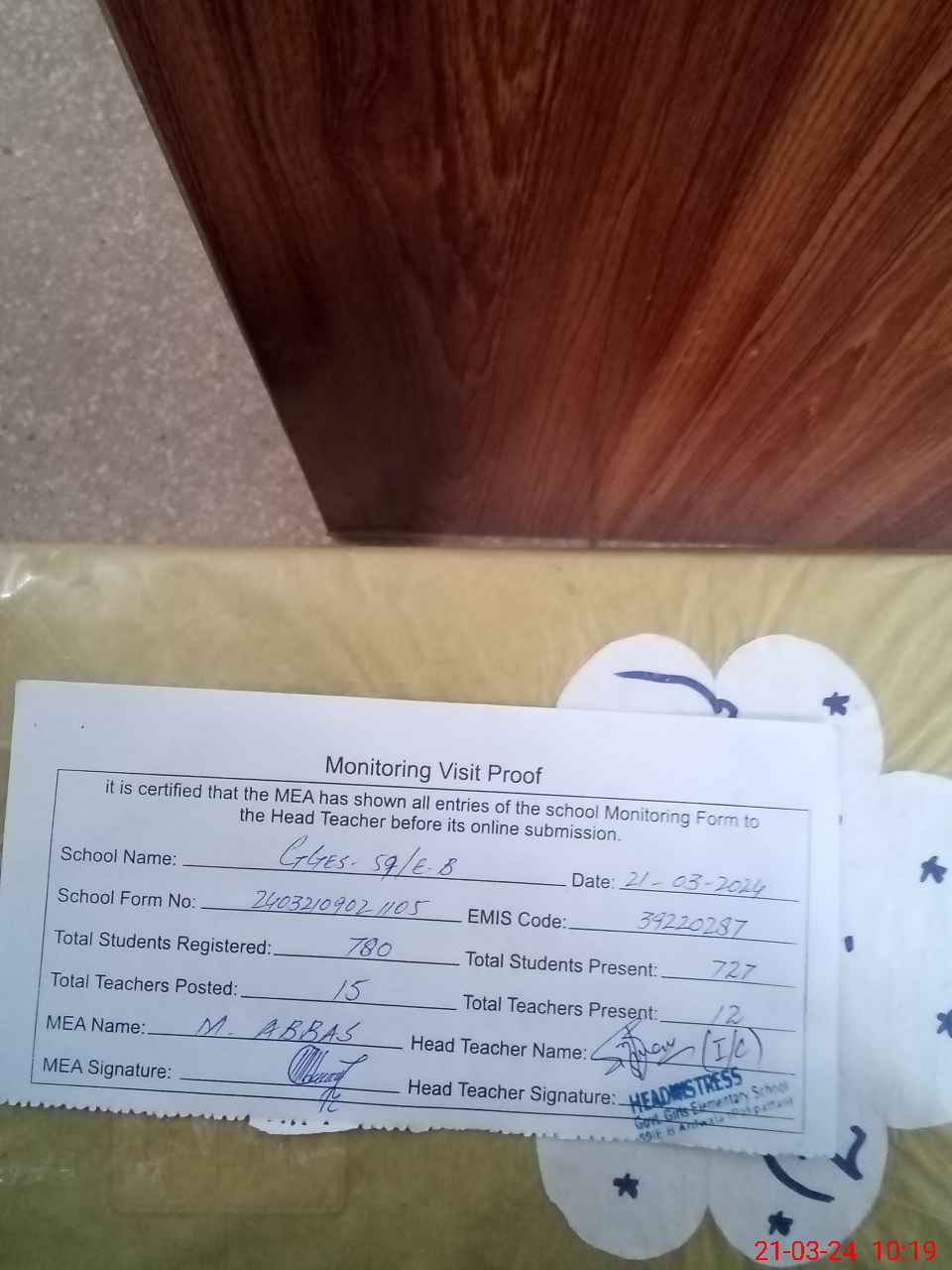 | Certified that this School was Inspected by the Undersigned MEA/DMO Today and the Information Stated Above is as Per Record. | |||||