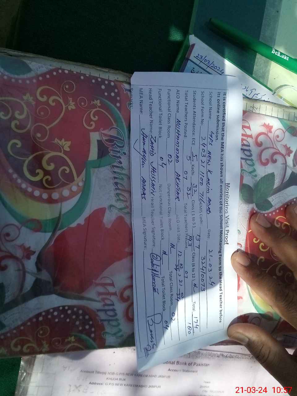 | EMIS Code: 32410073 | Name of School: GPS NEW KARIM ABAD | |||