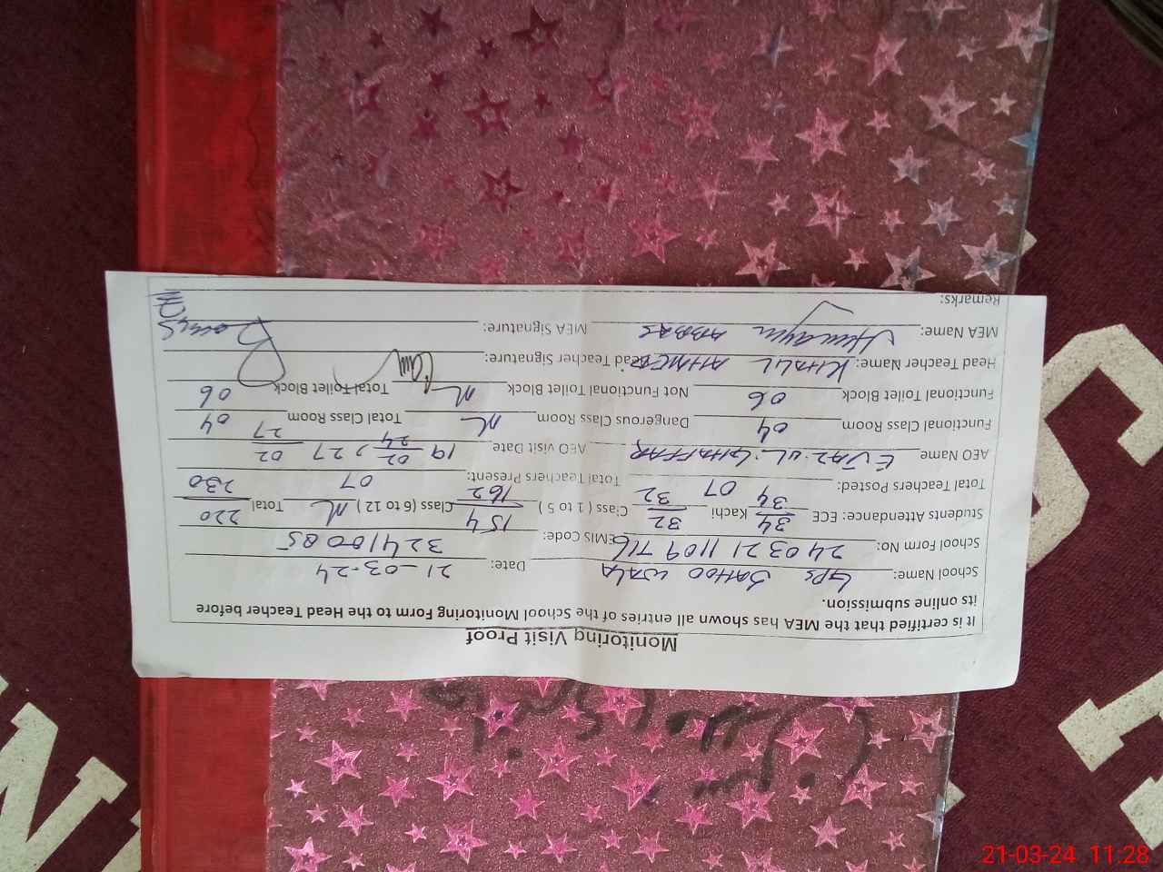 | Attendance Register | Head Teacher | MEA with School | Visit Proof |