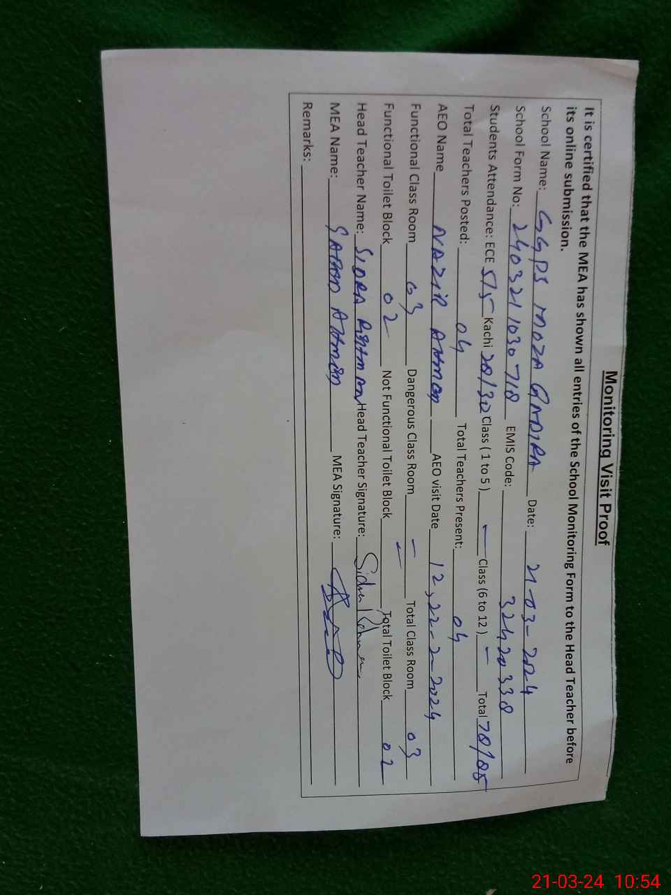 | Attendance Register | Head Teacher | MEA with School | Visit Proof |