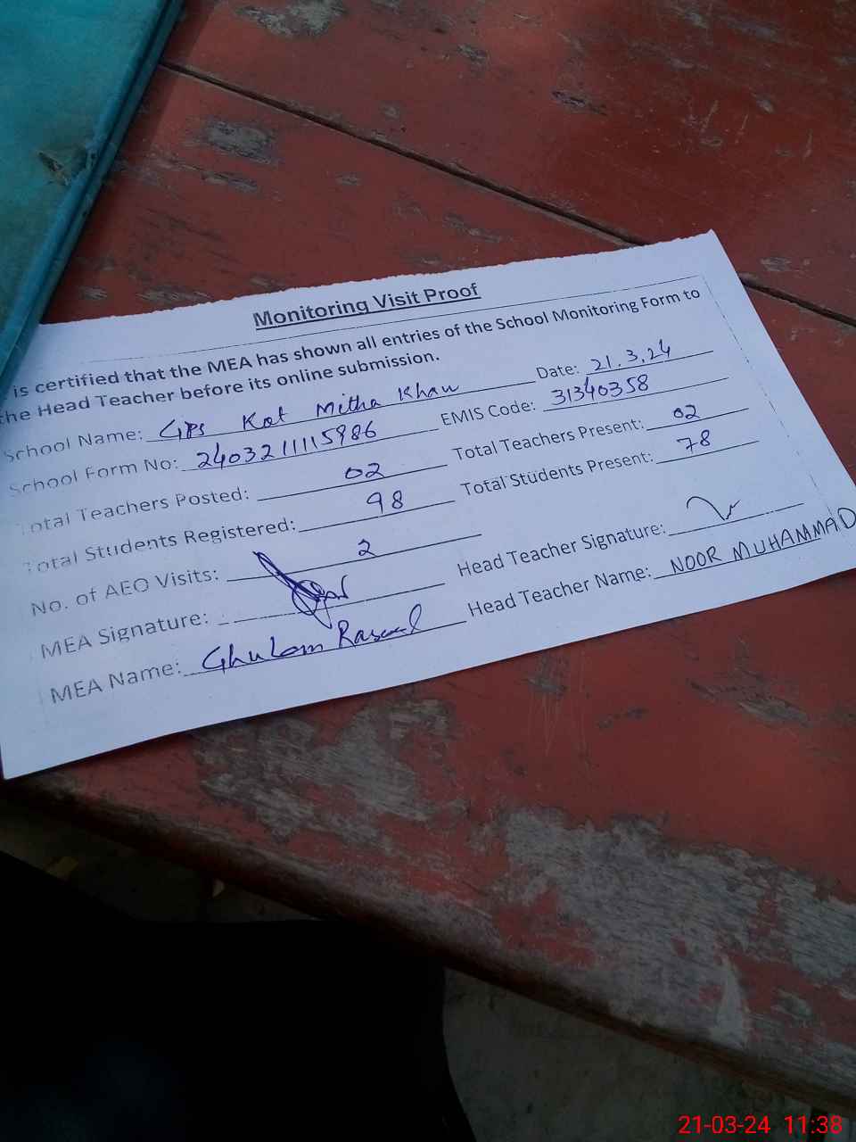 | EMIS Code: 31340358 | Name of School: GPS KOT MITHA KHAN | |||