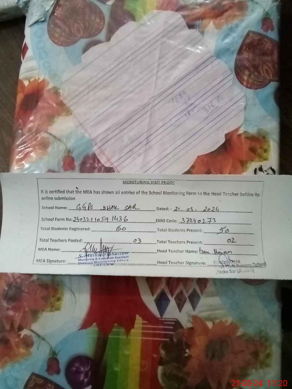 | EMIS Code: 37240273 | Name of School: GGPS DHOK SAR | |||