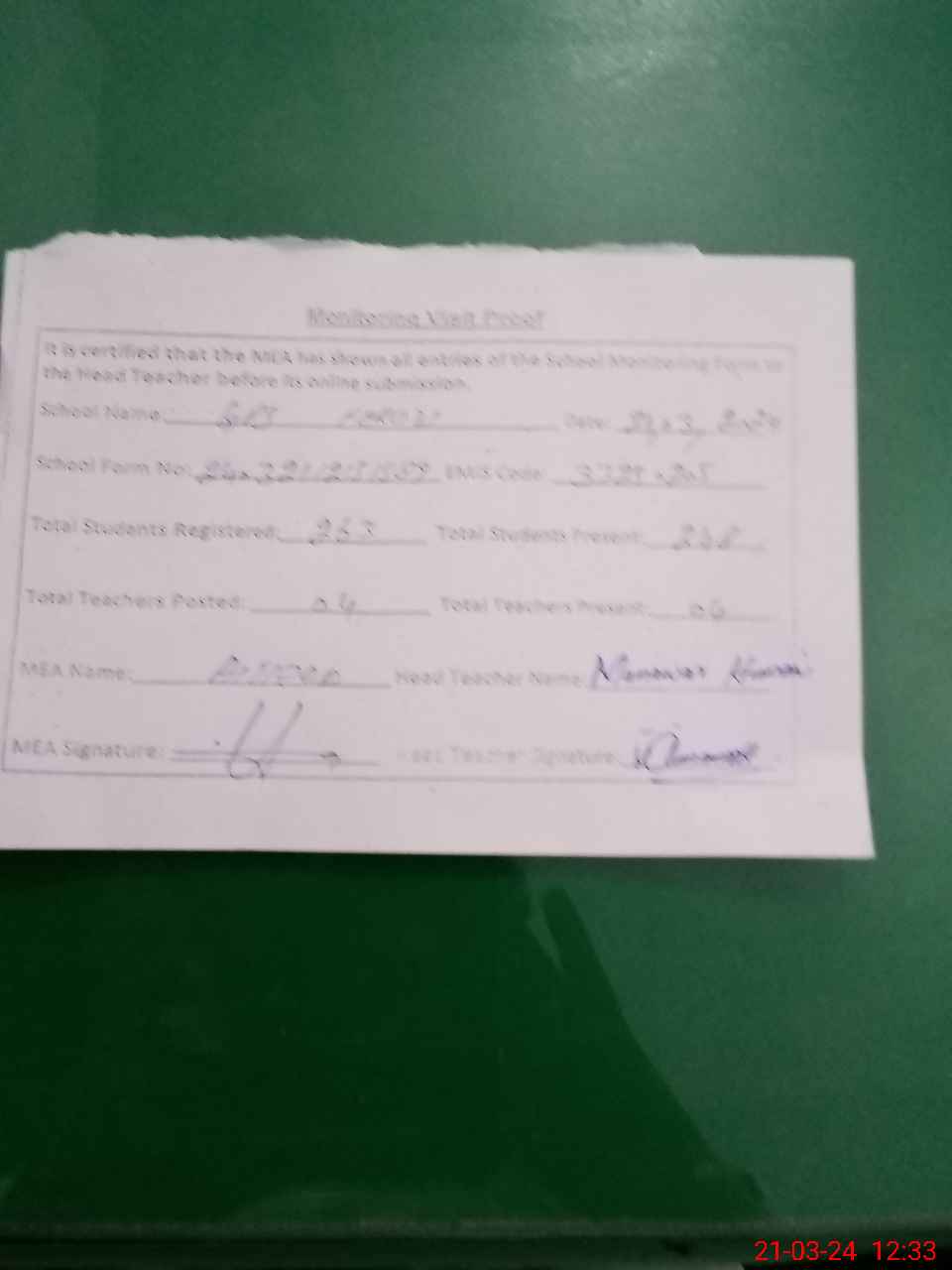 | Attendance Register | Head Teacher | MEA with School | Visit Proof |