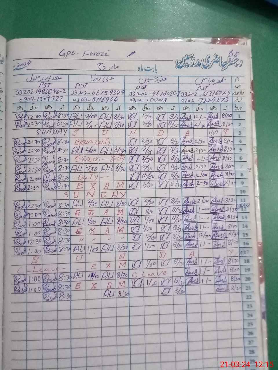| CNIC | Full Name | Designation | R/C | Absence During Last Calender Month |