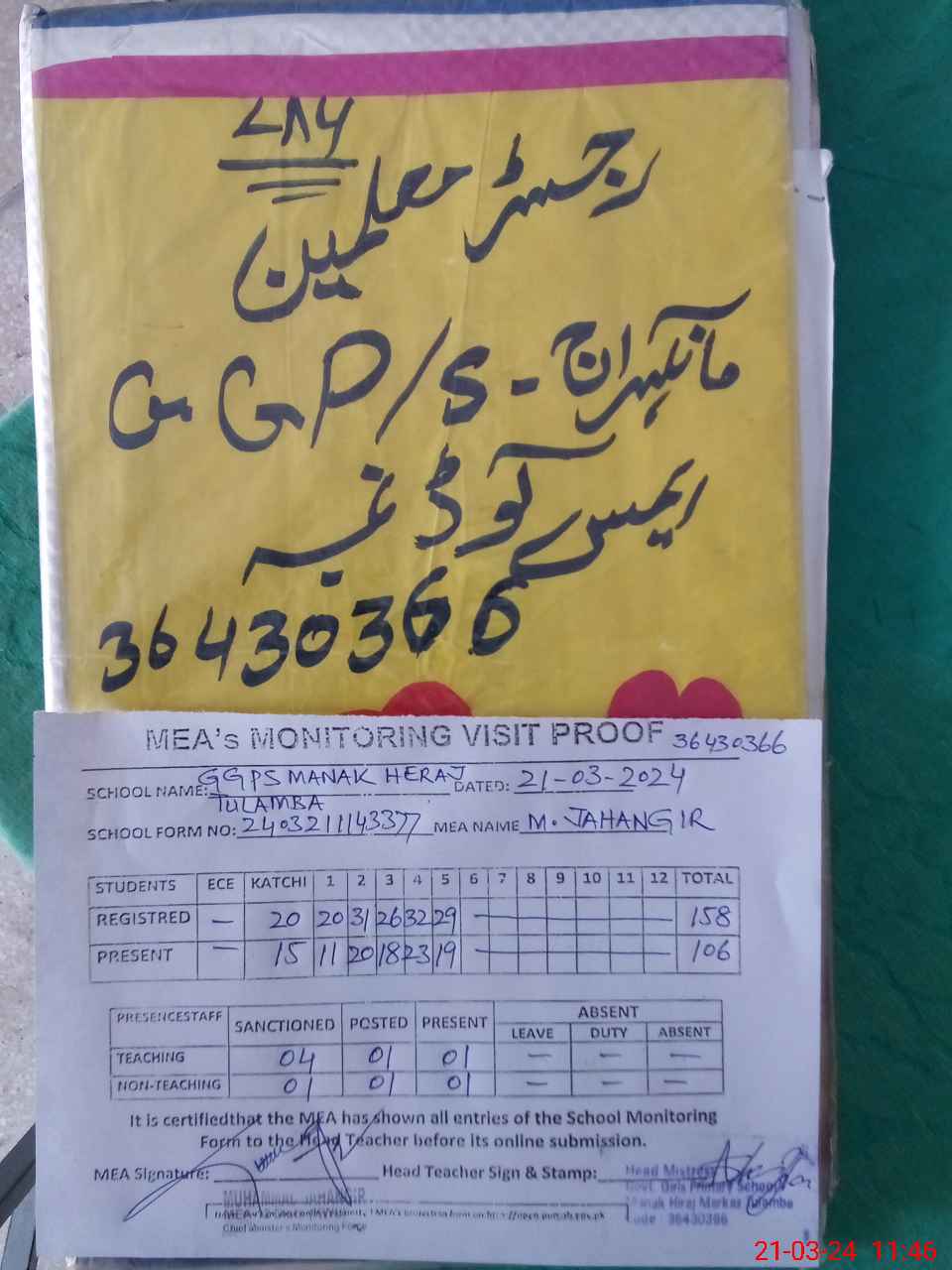 | Attendance Register | Head Teacher | MEA with School | Visit Proof |