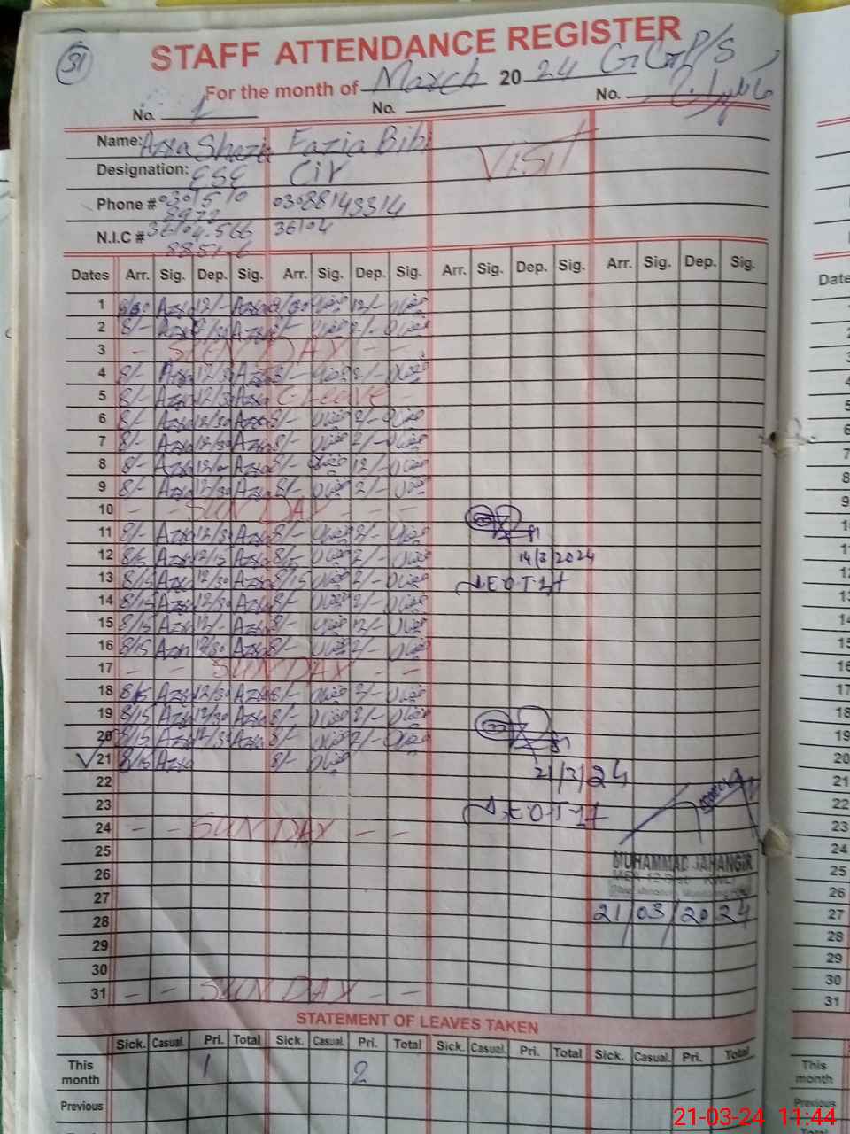 | CNIC | Full Name | Designation | R/C | Absence During Last Calender Month |