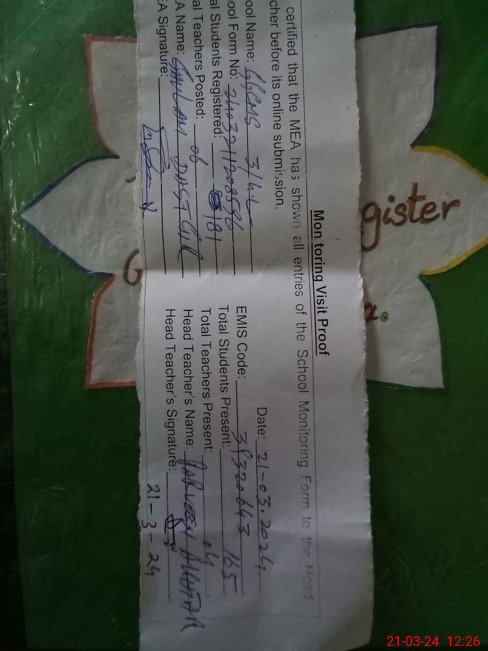 | Attendance Register | Head Teacher | MEA with School | Visit Proof |