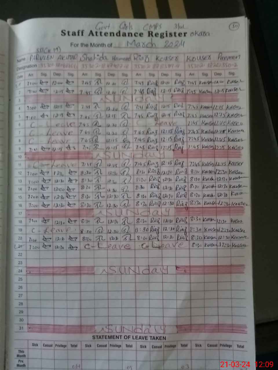| CNIC | Full Name | Designation | R/C | Absence During Last Calender Month |