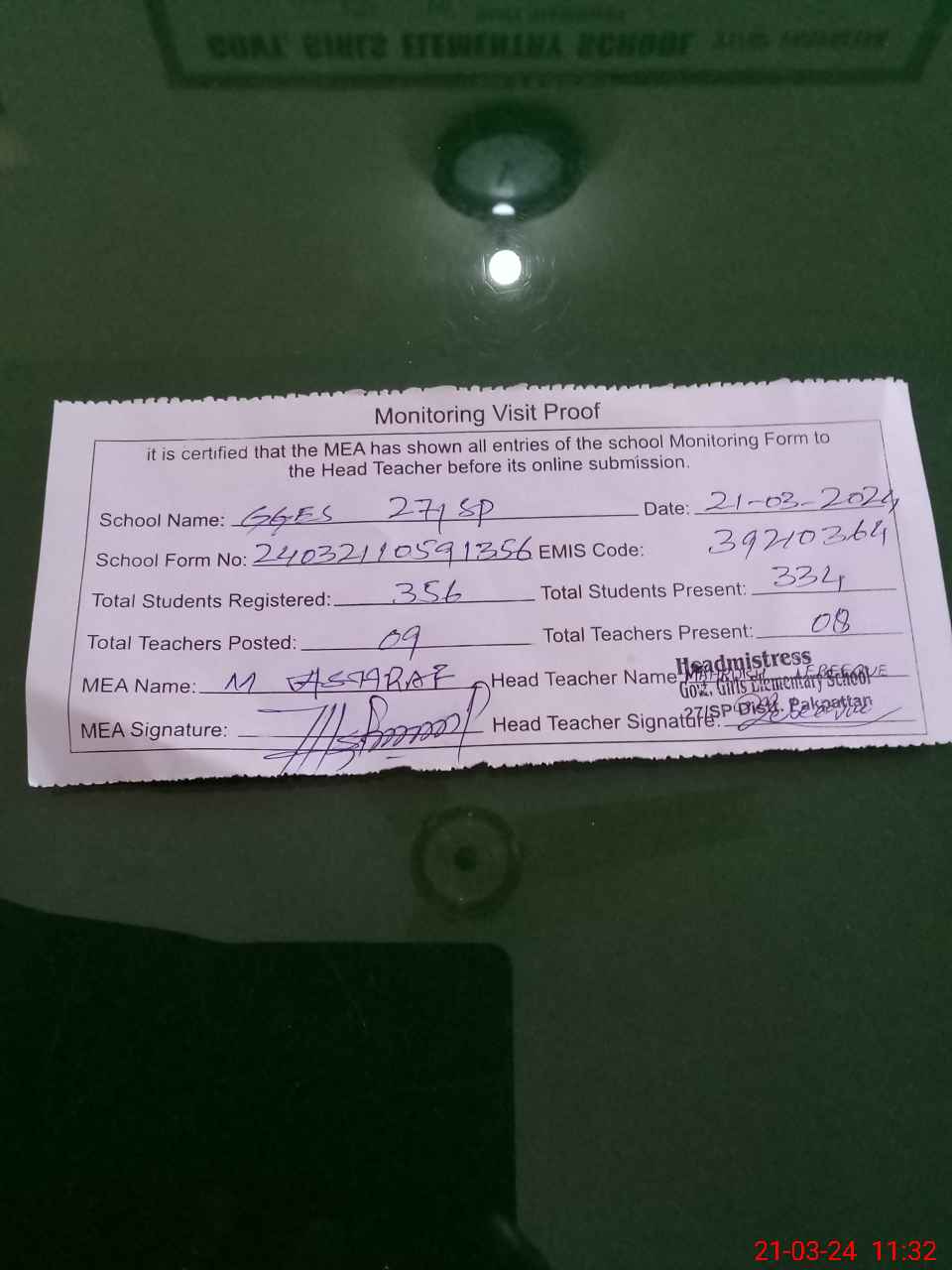 | Attendance Register | Head Teacher | MEA with School | Visit Proof |