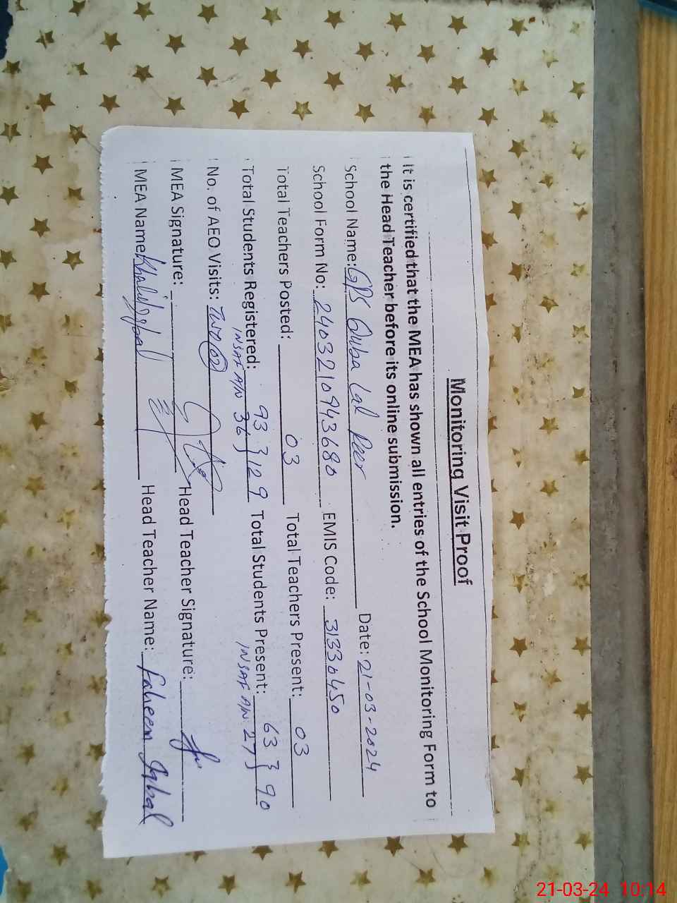 | EMIS Code: 31330450 | Name of School: GPS QUBA LAL PEER | |||