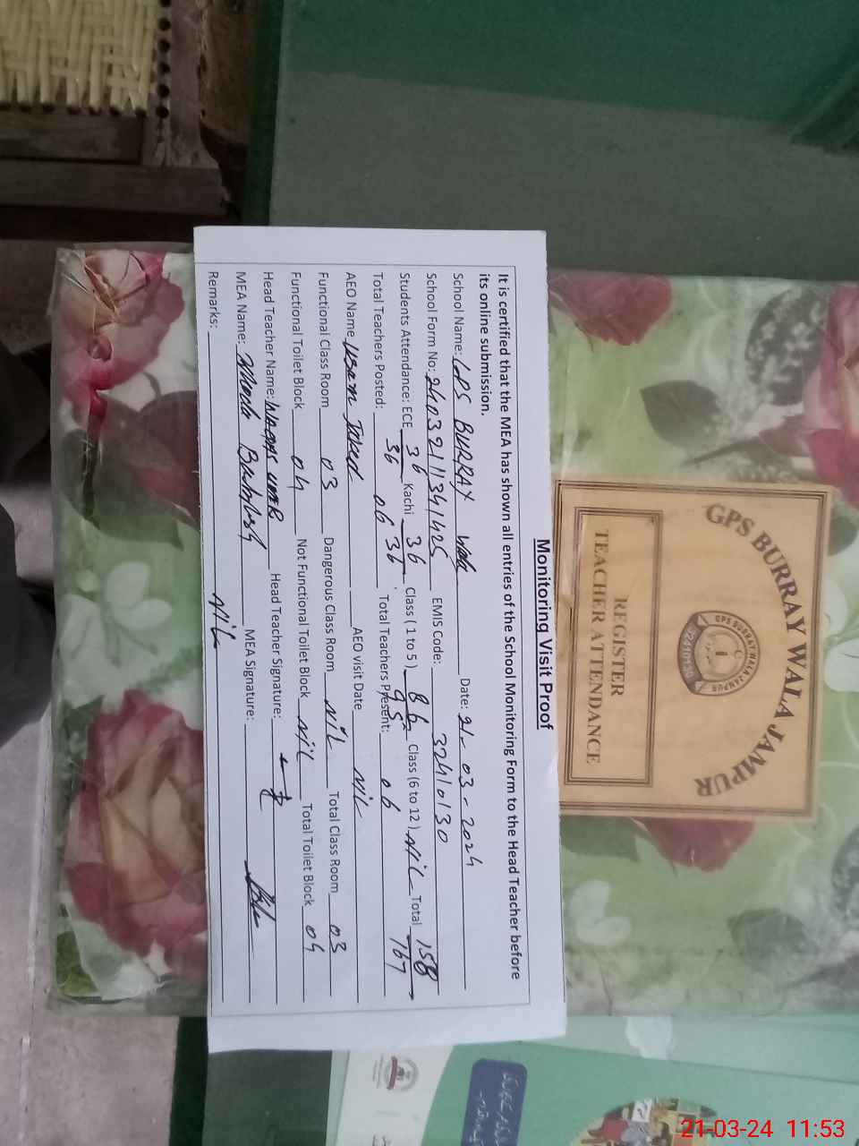 | Attendance Register | Head Teacher | MEA with School | Visit Proof |