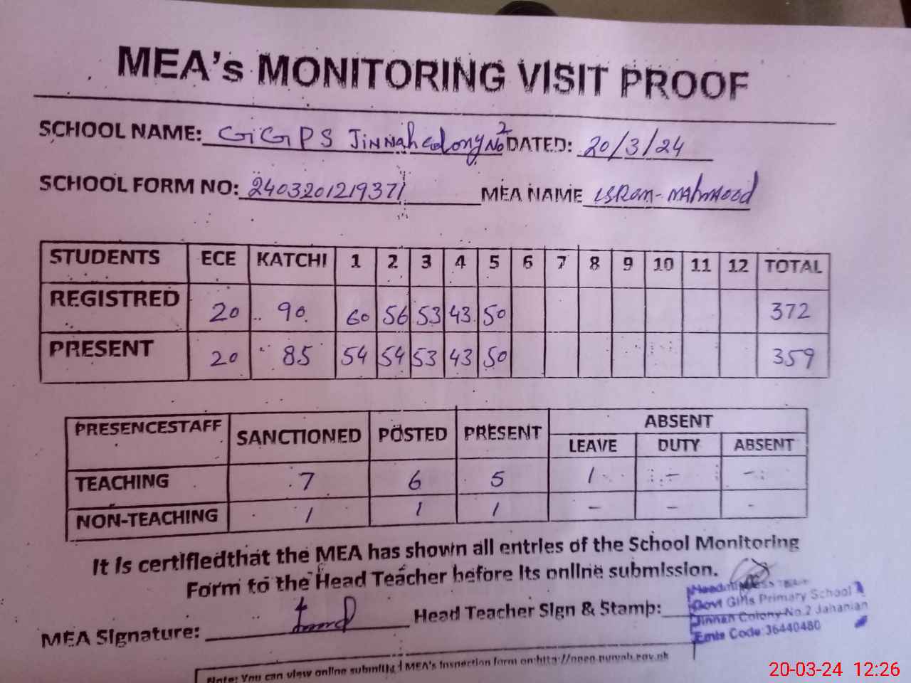 | Attendance Register | Head Teacher | MEA with School | Visit Proof |