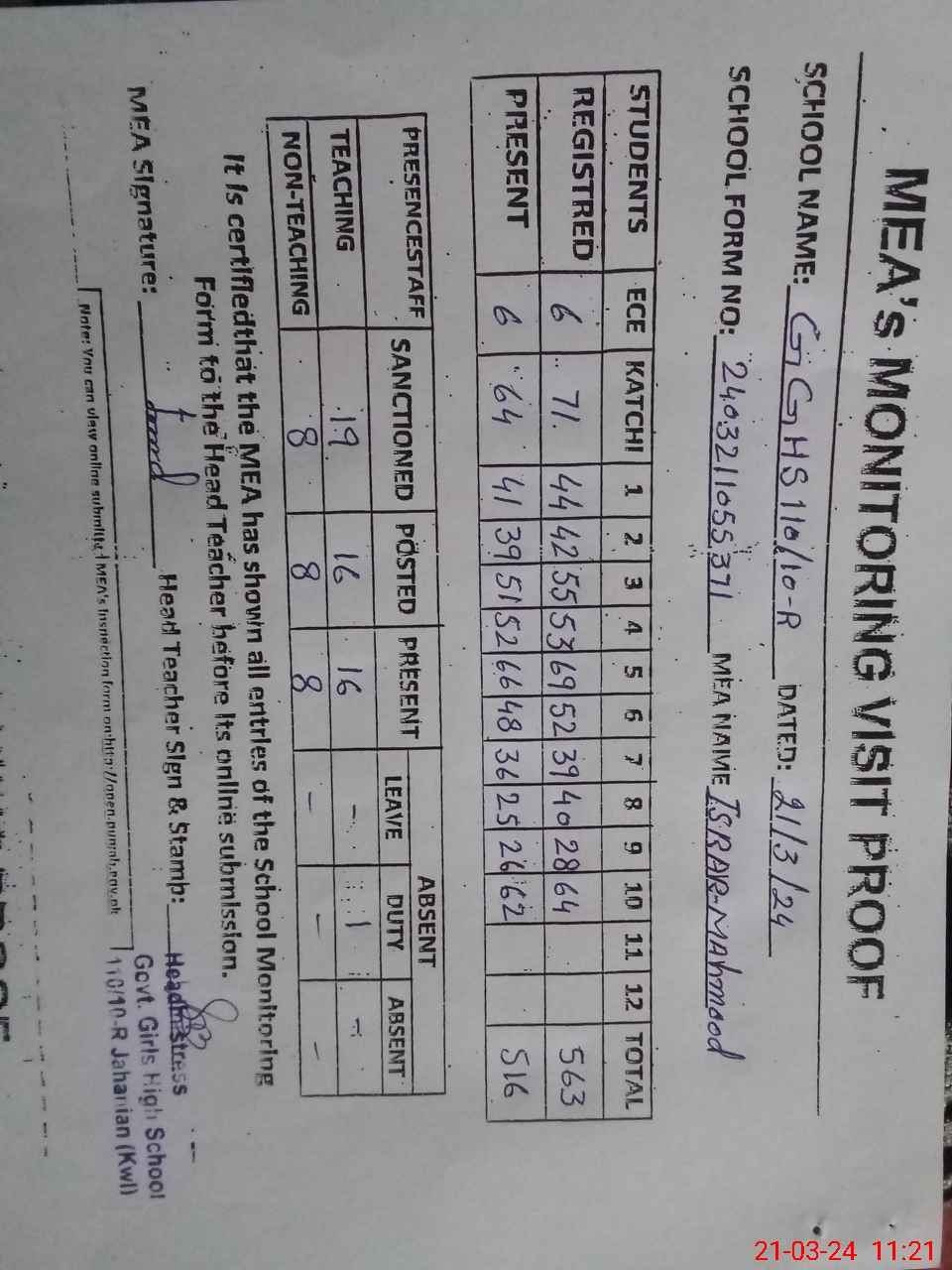 | Attendance Register | Head Teacher | MEA with School | Visit Proof |